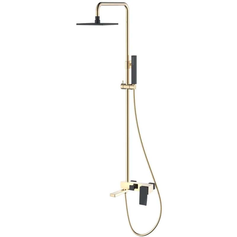 Душевая система Boheme Q 148-GB.2.Характеристики:Цвет: золото, черный.Материал: латунь.Регулируемая высота душевой стойки.Верхний душ прямоугольной формы.Ручной душ с держателем на стойке.Однорычажное переключение.Монтаж: на стену.Стандарт подключения: G 1/2.В комплекте поставкисмеситель; верхний душ; ручной душ; душевая штанга; душевой шланг; гибкая подводка G1/2; крепежный комплект.