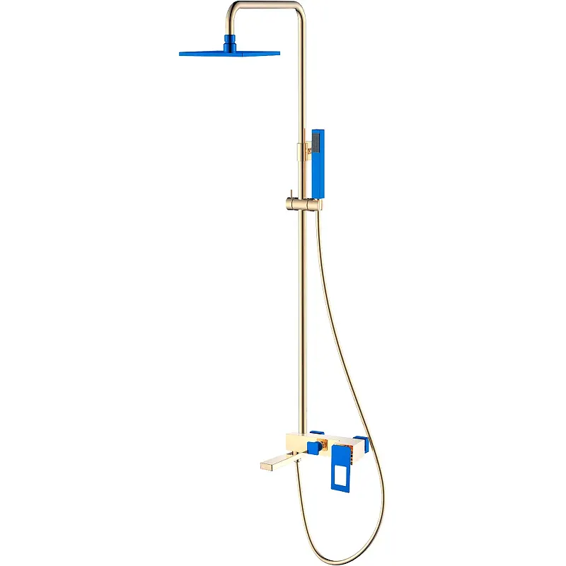 Душевая система Boheme Q 148-GUW.Характеристики: Цвет: золото, синий. Материал: латунь. Управление: однорычажное. Механизм: керамический картридж. Регулируемый размер душевой штанги: 920-1320 мм. Размер верхнего душа (ШхД): 200х200 мм. Излив: поворотный. Аэратор. Форма верхнего душа: квадратная. Форма ручного душа: прямоугольная. Количество режимов струи ручного душа: 1. Длина душевого шланга: 150 см. Держатель ручного душа регулируемый по высоте. Стандарт подводки: G 1/2. Встроенный девиатор, автоматически переключающий поток с душа на излив при закрытии воды. Монтаж: на стену. В комплекте поставки: Смеситель. Душевая стойка. Верхний душ. Ручной душ. Шланг для ручного душа. Инструкция.