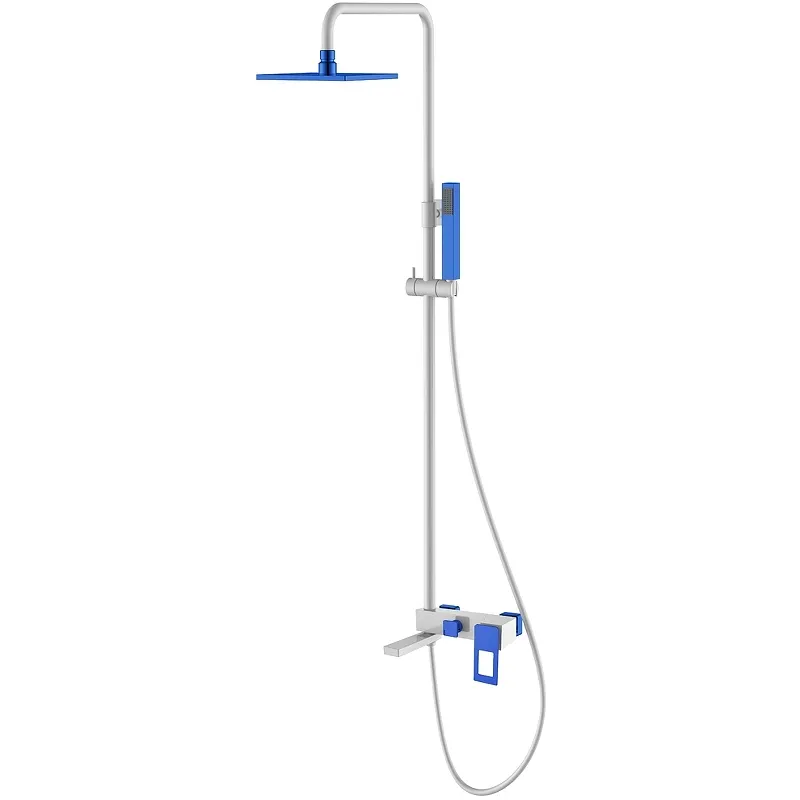 Душевая система Boheme Q 148-WUW.Характеристики: Цвет: белый, синий. Материал: латунь. Управление: однорычажное. Механизм: керамический картридж. Регулируемый размер душевой штанги: 920-1320 мм. Размер верхнего душа (ШхД): 200х200 мм. Излив: поворотный. Аэратор. Форма верхнего душа: квадратная. Форма ручного душа: прямоугольная. Количество режимов струи ручного душа: 1. Длина душевого шланга: 150 см. Держатель ручного душа регулируемый по высоте. Стандарт подводки: G 1/2. Встроенный девиатор, автоматически переключающий поток с душа на излив при закрытии воды. Монтаж: на стену. В комплекте поставки: Смеситель. Душевая стойка. Верхний душ. Ручной душ. Шланг для ручного душа. Инструкция.