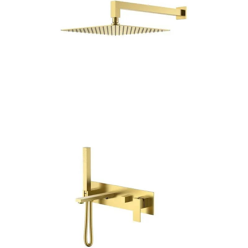 Душевая система Boheme Qubic 474-MG.Характеристики: Цвет: золото матовое. Материал: латунь. Покрытие: PVD и высочайший уровень полировки. Управление: однорычажное. Механизм: керамический картридж Sedal. Излив: фиксированный. Аэратор Neoperl Cascade. Длина душевого шланга: 150 см. Верхний и ручной душ с функцией легкое очищение от известкового налета. Стандарт подводки: 1/2. Форма верхнего душа: квадратная. Размер верхнего душа (ШхД): 300х300 мм. Форма ручного душа: прямоугольная. Количество режимов струи ручного душа: 1. Отверстия для монтажа: 2. Монтаж: встраиваемый. В комплекте поставки: Смеситель (внешняя и внутренняя часть). Кронштейн для верхнего душа. Верхний душ. Ручная лейка. Душевой шланг. Комплект креплений.