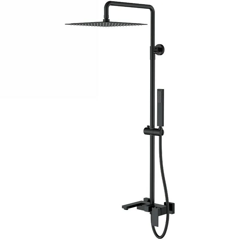 Душевая система Boheme Qubic 478-B.Характеристики: Цвет: черный матовый. Материал: латунь. Покрытие: PVD и высочайший уровень полировки. Управление: однорычажное. Механизм: керамический картридж Sedal. Излив: фиксированный. Аэратор Neoperl Cascade. Девиатор. Душевая штанга регулируется по высоте: 920-1320 мм. Держатель ручного душа регулируемый по высоте. Длина душевого шланга: 150 см. Верхний и ручной душ с функцией легкое очищение от известкового налета. Стандарт подводки: 1/2. Форма верхнего душа: квадратная. Размер верхнего душа (ШхД): 300х300 мм. Форма ручного душа: прямоугольная. Количество режимов струи ручного душа: 1. Отверстия для монтажа: 3. Монтаж: на стену. В комплекте поставки: Смеситель с изливом. Душевая штанга. Верхний душ. Ручная лейка. Душевой шланг. Комплект креплений.