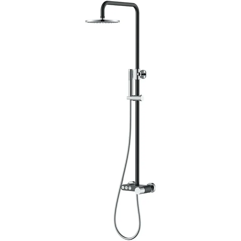 Душевая система Boheme Stick 128-BCR.Характеристики: Цвет: черный, хром. Ручка: Diamond. Материал: латунь. Управление: однорычажное. Механизм: керамический картридж. Излив: фиксированный. Тип излива: каскадный (расположен снизу на корпусе). Форма верхнего душа: круглая. Форма ручного душа: прямоугольная. Диаметр верхнего душа: 230 мм. Длина душевого шланга: 150 см. Держатель ручного душа регулируемый по высоте. Стандарт подводки: G 1/2. Количество режимов струи ручного душа: 1. Монтаж: на стену. В комплекте поставки: Смеситель. Душевая стойка. Верхний душ. Ручной душ. Шланг для ручного душа.