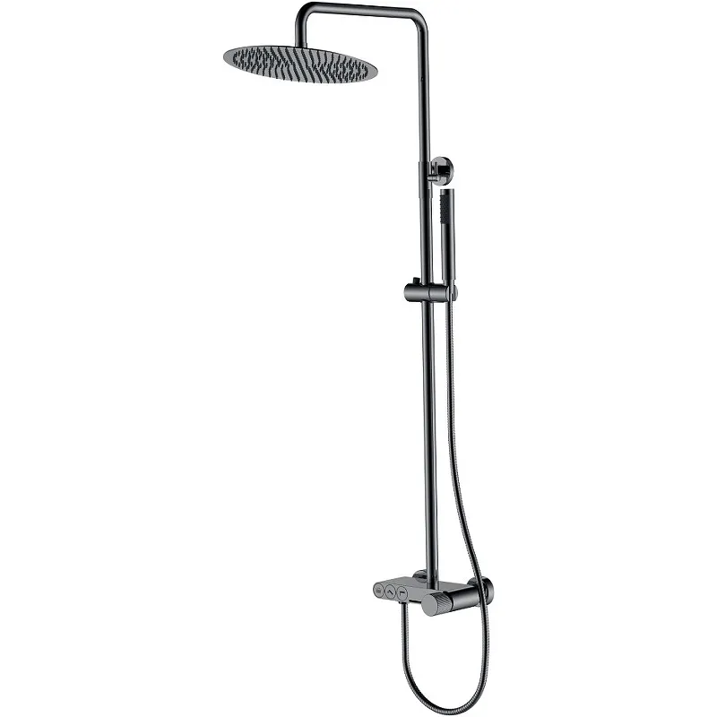 Душевая система Boheme Stick 128-SGM.3Характеристики: Цвет: оружейная сталь глянцевая. Материал: латунь. Ручка: Linea. Механизм: керамический картридж. Управление: однорычажное. Излив: фиксированный. Тип излива: каскадный (расположен снизу на корпусе). Форма верхнего душа: круглая. Форма ручного душа: прямоугольная. Диаметр верхнего душа: 300 мм. Длина душевого шланга: 150 см. Количество режимов струи ручного душа: 1. Держатель ручного душа регулируемый по высоте. Стандарт подводки: G 1/2. Отверстия для монтажа: 2. Монтаж: на стену. В комплекте поставки: Смеситель. Душевая стойка. Верхний душ. Ручной душ. Душевой шланг.