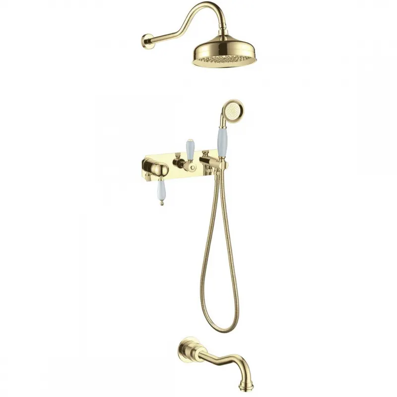 Душевая система Boheme Tradizionale Oro 288.Характеристики:Цвет: золото. Материал: латунь. Керамические ручки. Диаметр верхнего душа: 208 мм. Ручной душ с одним режимом. Механизм: керамический картридж. Управление: однорычажное. Стандарт подводки: G 1/2. Монтаж: внутренний (скрытый монтаж).В комплекте поставки:смеситель; верхний душ; ручной душ; душевой шланг.