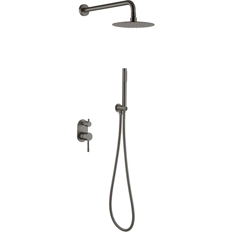 Душевая система Boheme Uno 464-GM.Идеальный вариант для интерьера в современном стиле благодаря высокому качеству и превосходному дизайну.Характеристики: Материал: латунь. Цвет: оружейная сталь. Покрытие: матовое. Управление: рычажное. Девиатор. Стандарт подводки: 1/2. Механизм: керамический картридж. Монтаж: встраиваемый. В комплекте поставки: Смеситель встроенный. Настенный держатель. Верхний душ. Ручной душ.