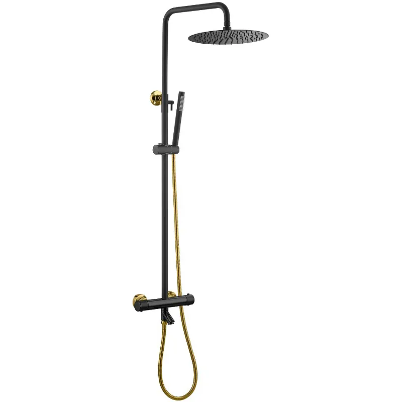 Душевая система Boheme Uno 468-T-BG с термостатом.Характеристики: Цвет: черный матовый, золото. Материал: латунь. Управление: термостат. Механизм: термостатический картридж. Излив: фиксированный. Стандарт подводки: 1/2. Аэратор. Форма верхнего душа: круглая. Диаметр верхнего душа: 300 мм. Форма ручного душа: прямоугольная. Количество режимов струи ручного душа: 1. Длина душевого шланга: 1500 мм. Регулируемый размер душевой штанги: 1000-1400 мм. Монтаж: на стену. В комплекте поставки: Смеситель. Верхний душ. Ручной душ. Душевая штанга. Душевой шланг. Держатель ручного душа.