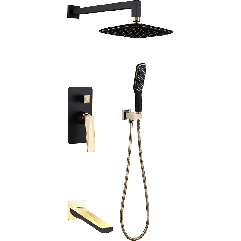 Душевая система Boheme Venturo 384-B-2.Характеристики: Цвет: черный, золото. Материал: латунь. Поверхность: глянцевая. Управление: однорычажное. Механизм: керамический картридж. Стандарт подводки: G 1/2. Тип излива: фиксированный. С переключателем потока. Монтаж: встраиваемый. Количество отверстий для монтажа: 4. В комплекте поставки: Смеситель (внешняя и внутренняя часть). Излив. Верхний душ. Ручной душ. Держатель ручного душа.
