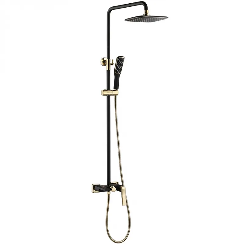 Душевая система Boheme Venturo 388-B.Характеристики:Цвет: черный, золото.Материал: латунь.Верхний душ прямоугольной формы.Размер верхнего душа (ШхД): 250х250 мм.Ручной душ с держателем на стойке.Однорычажное переключение.Монтаж: на стену.Стандарт подключения: G 1/2.В комплекте поставкисмеситель; верхний душ; ручной душ; душевая штанга; душевой шланг; гибкая подводка G1/2; крепежный комплект.