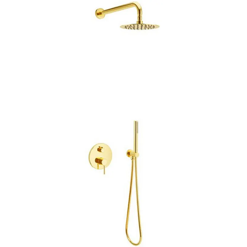 Душевая система Excellent Pi AREX.SET.1245GL.Характеристики: Материал: латунь. Цвет: золото. Монтаж: скрытый Верхний душ диаметром 20 см. Душевой кронштейн, длина 40 см. Душевая лейка с 1 режимом струи. Угловой соединительный элемент с держателем для душевой лейки. Душевой шланг в пластиковой оплетке. В комплекте поставки: Смеситель (внешняя и внутренняя часть). Верхний душ с кронштейном. Душевой шланг. Душевая лейка. Держатель для душа.