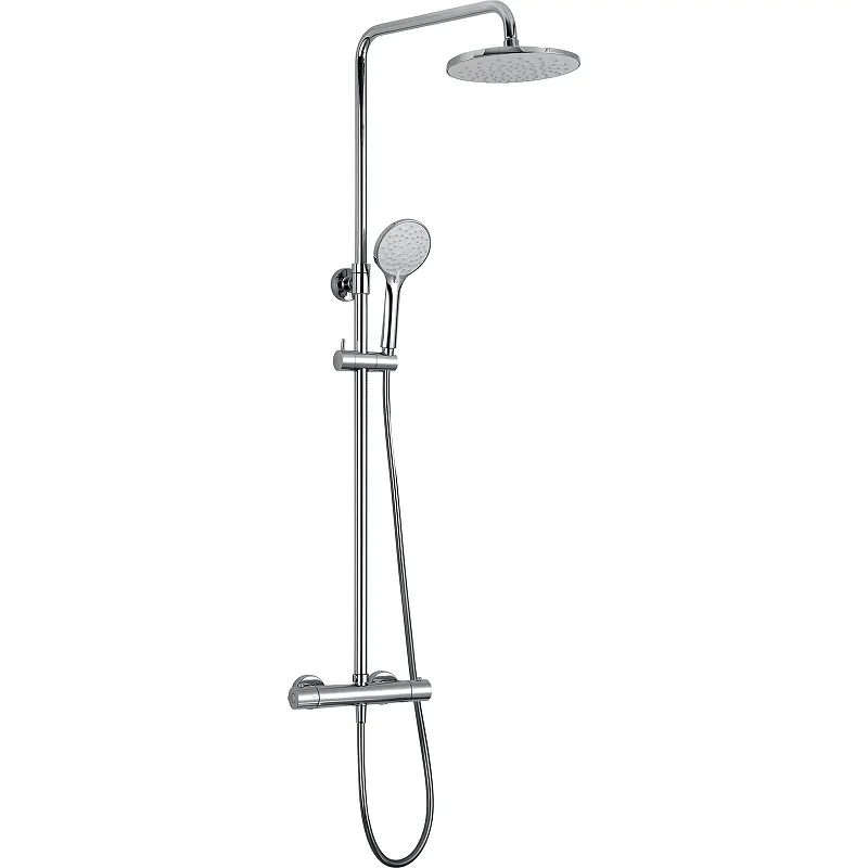 Душевая система Koller Pool Round RNST002 с термостатом.Характеристики: Материал: латунь. Цвет: хром. Механизм: термостатический картридж. Управление: термостат. Душевая штанга с регулируемой по высоте. Верхний душ: круглый: 22,5 x 22,5 см. Ручной душ с регулируемым держателем. Количество режимов струи ручного душа: 1. Душевой шланг из пластика длиной 150 см. Монтаж: на стену. В комплекте поставки: Смеситель. Душевая штанга с кронштейном и держателем ручного душа. Верхний душ. Ручной душ. Душевой шланг.