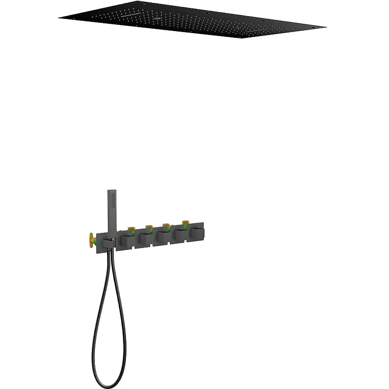 - Современный стиль: Черный матовый цвет и прямоугольная форма верхнего душа подойдут для любого интерьера.
