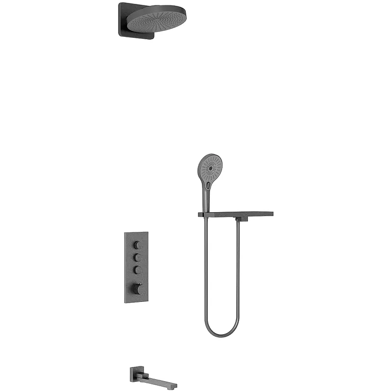 Душевая система Vincea Inspire VSFW-433TI1RGM с термостатом.Характеристики: Цвет: вороненая сталь. Материал: латунь. Материал ручного душа: ABS-пластик. Материал верхнего душа с кронштейном: латунь, ABS-пластик. Управление: термостат. Механизм: термостатический картридж Vernet. Предохранительная остановка при 40 градусов. Излив: поворотный на 180 градусов. Аэратор. Количество потребителей: 3. Форма верхнего душа: круглая. Диаметр верхнего душа: 247 мм. Кронштейн вертикально наклоняется на 13-30 градусов. Размер ручного душа (ШхВ): 130х268 мм. Количество режимов ручного душа: 3. Переключение режимов ручного душа: кнопочное. Душевой шланг из ПВХ, длиной 1500 мм. Функция экономии расхода воды. Ограничитель температуры. Легкая очистка форсунок от известкового налета. Полка из нержавеющей стали с шланговым подключением и держателем ручного душа. Стандарт подводки: G 1/2. Монтаж: встраиваемый. В комплекте поставки: Смеситель для душа (внешняя и внутренняя часть). Излив. Верхний душ. Ручной душ. Кронштейн для верхнего душа. Душевой шланг. Полка с шланговым подключением и держателем ручного душа.