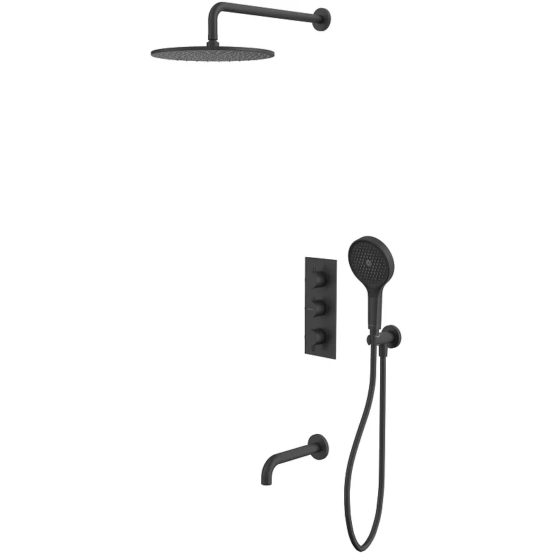 Душевая система Whitecross Y black YSET11TOPBL с термостатом.Характеристики: Цвет: черный матовый. Материал: латунь. Материал ручного душа: пластик. Покрытие: порошковая покраска. Управление: термостат. Механизм: термостатический картридж с ограничителем на 38 градусов Vernet. Излив: фиксированный. Скрытый аэратор Neoperl. Запорно-переключающий вентиль. Количество потребителей: 3. Два входа (для горячей и холодной воды) G 3/4. Три выхода смешанной воды G 1/2. Пропускная способность при давлении 3 Бар: поток 1 - 21 л/мин, поток 2 - 21 л/мин, поток 3 - 22 л/мин. Диаметр верхнего душа: 300 мм. Система очистки от известковых отложений. Шаровый шарнир. Размер ручного душа (ШхВ): 132х250.1 мм. Количество режимов струи ручного душа: 3. Переключение режимов ручного душа: кнопочное. Пропускная способность при давлении 3 Бар: верхний душ - 21 л/мин, ручной душ - 13.5 л/мин, излив - 22 л/мин. Длина кронштейна верхнего душа: 405 мм. Душевой шланг в пластиковой оплетке, длиной 1500 мм. Двусторонняя защита от скручивания. Конические гайки. Шланговое подключение с держателем ручного душа с пластиковой вставкой. Монтаж: встраиваемый. В комплекте поставки: Смеситель для душа (внешняя и внутренняя части) Y1238BL. Излив Y1200BL. Ручной душ TOP-BL. Верхний душ Y1300BL. Кронштейн для верхнего душа Y1310BL. Душевой шланг SHP150BL. Шланговое подключение с держателем ручного душа Y1005BL.