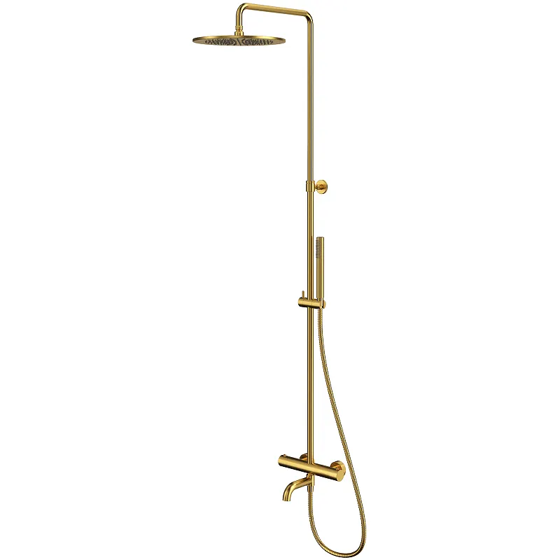 Душевая система Whitecross Y brushed gold Y1234GLB с термостатом.Характеристики: Цвет: брашированное золото. Материал: латунь. Управление: термостат. Механизм: термостатический картридж с ограничителем на 38 градусов Vernet. Излив: фиксированный. Скрытый аэратор: Neoperl. Стандарт подводки: G1/2. Запорно-переключающий вентиль. Диаметр верхнего душа: 300 мм. Количество режимов струи ручного душа: 1. Пропускная способность при давлении 3 Бар: верхний душ - 13.6 л/мин, ручной душ - 12.6 л/мин, излив - 18 л/мин. Поворотный кронштейн верхнего душа с регулировкой высоты: 960-1500 мм. Душевой шланг в металлической оплетке, длиной 1500 мм. Двусторонняя защита от скручивания. Монтаж: на стену. В комплекте поставки: Смеситель для ванны. Ручной душ. Верхний душ. Душевая штанга. Душевой шланг. Держатель ручного душа.