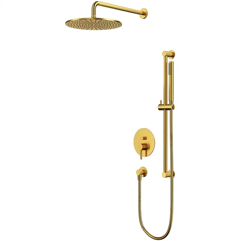Душевая система Whitecross Y brushed gold YSET05GLB.Характеристики: Цвет: брашированное золото. Материал: латунь. Механизм: керамический картридж Kerox. Управление: однорычажное. Автоматический переключатель. Количество потребителей: 2. Два входа (для горячей и холодной воды) G 1/2. Два выхода смешанной воды G 1/2. Пропускная способность при давлении 3 Бар: поток 1 - 21 л/мин / поток 2 - 17.7 л/мин. Диаметр верхнего душа: 300 мм. Система очистки от известковых отложений. Шаровый шарнир. Размер ручного душа (ШхВхД): 26х225х26. Количество режимов струи ручного душа: 1. Держатель ручного душа регулируемый по высоте. Пропускная способность при давлении 3 Бар: верхний душ - 21 л/мин, ручной душ - 13.5 л/мин. Длина кронштейна верхнего душа: 405 мм. Душевой шланг в металлической оплетке, длиной 1500 мм. Двусторонняя защита от скручивания. Высота душевой штанги: 720 мм. Монтаж: встраиваемый. В комплекте поставки: Смеситель для душа (внешняя и внутренняя части) Y1235GLB. Ручной душ MICRO-GLB. Верхний душ Y1300GLB. Кронштейн для верхнего душа Y1310GLB. Душевой шланг SHS150GLB. Душевая штанга с держателем для ручного душа Y1010GLB. Шланговое подключение Y1008GLB.