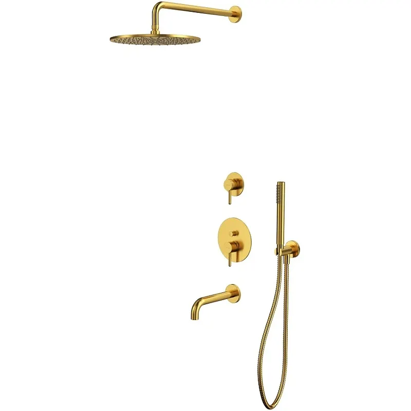 Душевая система Whitecross Y brushed gold YSET07GLB.Характеристики: Цвет: брашированное золото. Материал: латунь. Управление: однорычажное. Механизм: керамический картридж Kerox. Излив: фиксированный. Аэратор Neoperl. Автоматический переключатель. Количество потребителей: 3. Два входа (для горячей и холодной воды) G 1/2. Два выхода смешанной воды G 1/2. Держатель ручного душа с пластиковой вставкой. Диаметр верхнего душа: 300 мм. Система очистки от известковых отложений. Шаровый шарнир. Размер ручного душа (ШхВхД): 26х225х26. Количество режимов струи ручного душа: 1. Пропускная способность при давлении 3 Бар: верхний душ - 23 л/мин / ручной душ - 13,5 л/мин / излив - 21 л/мин. Длина кронштейна верхнего душа: 405 мм. Душевой шланг в металлической оплетке, длиной 1500 мм. Двусторонняя защита от скручивания. Отверстия для монтажа: 5. Монтаж: встраиваемый. В комплекте поставки: Смеситель (внешняя и внутренняя части) на 2 потребителя - Y1235GLB. Смеситель (внешняя и внутренняя части) на 1 потребитель - Y1245GLB. Излив Y1200GLB. Ручной душ MICRO-GLB. Верхний душ Y1300GLB. Кронштейн для верхнего душа Y1310GLB. Душевой шланг SHS150GLB. Шланговое подключение с держателем ручного душа Y1005GLB.