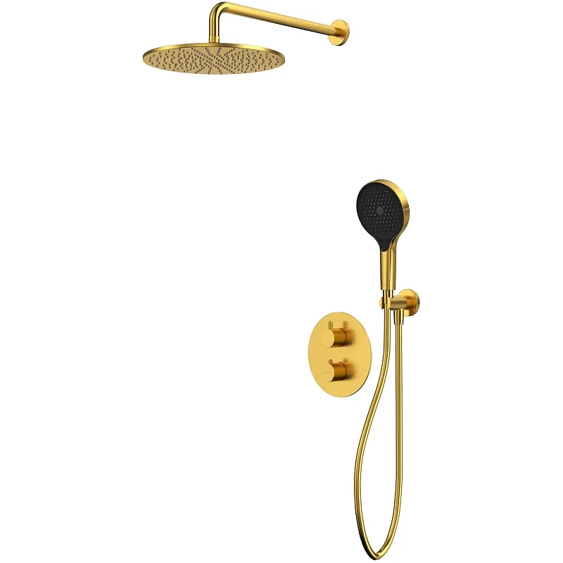 Душевая система Whitecross Y brushed gold YSET08TOPGLB с термостатом.Характеристики: Цвет: брашированное золото. Материал: латунь. Материал ручного душа: пластик. Покрытие: PVD. Управление: термостат. Механизм: термостатический картридж с ограничителем на 38 градусов Vernet. Запорно-переключающий вентиль. Количество потребителей: 2. Два входа (для горячей и холодной воды) G 3/4. Два выхода смешанной воды G 1/2. Пропускная способность при давлении 3 Бар: поток 1 - 20.3 л/мин, поток 2 - 20.3 л/мин. Диаметр верхнего душа: 300 мм. Система очистки от известковых отложений. Шаровый шарнир. Размер ручного душа (ШхВ): 132х250.1 мм. Количество режимов струи ручного душа: 3. Переключение режимов ручного душа: кнопочное. Пропускная способность при давлении 3 Бар: верхний душ - 20.3 л/мин, ручной душ - 13.5 л/мин. Длина кронштейна верхнего душа: 405 мм. Душевой шланг в пластиковой оплетке, длиной 1500 мм. Двусторонняя защита от скручивания. Конические гайки. Шланговое подключение с держателем ручного душа с пластиковой вставкой. Монтаж: встраиваемый. В комплекте поставки: Смеситель для душа (внешняя и внутренняя части) Y1236GLB. Ручной душ TOP-GLB. Верхний душ Y1300GLB. Кронштейн для верхнего душа Y1310GLB. Душевой шланг SHP150GLB. Шланговое подключение с держателем ручного душа Y1005GLB.