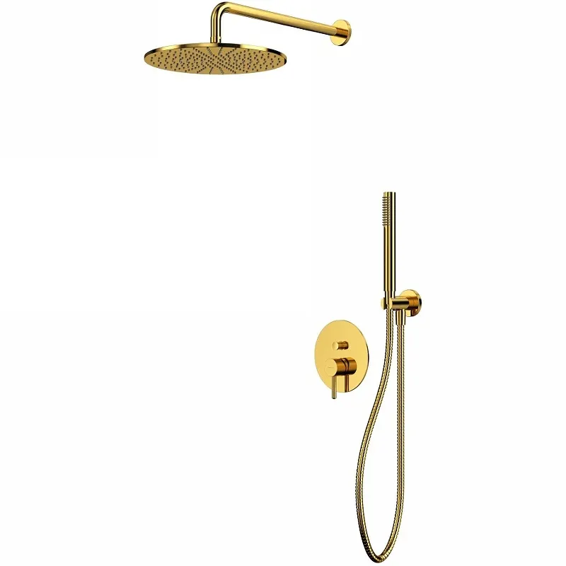 Душевая система Whitecross Y gold YSET04GL.Характеристики: Цвет: золото. Материал: латунь. Управление: однорычажное. Механизм: керамический картридж Kerox. Автоматический переключатель. Количество потребителей: 2. Два входа (для горячей и холодной воды) G 1/2. Два выхода смешанной воды G 1/2. Держатель ручного душа с пластиковой вставкой. Диаметр верхнего душа: 300 мм. Система очистки от известковых отложений. Шаровый шарнир. Размер ручного душа (ШхВхД): 26х225х26. Количество режимов струи ручного душа: 1. Пропускная способность при давлении 3 Бар: верхний душ - 21 л/мин / ручной душ - 13.5 л/мин. Длина кронштейна верхнего душа: 405 мм. Душевой шланг в металлической оплетке, длиной 1500 мм. Двусторонняя защита от скручивания. Отверстия для монтажа: 3. Монтаж: встраиваемый. В комплекте поставки: Смеситель для душа (внешняя и внутренняя части) на 2 потребителя - Y1235GL. Ручной душ MICRO-GL. Верхний душ Y1300GL. Кронштейн для верхнего душа Y1310GL. Душевой шланг SHS150GL. Шланговое подключение с держателем ручного душа Y1005GL.