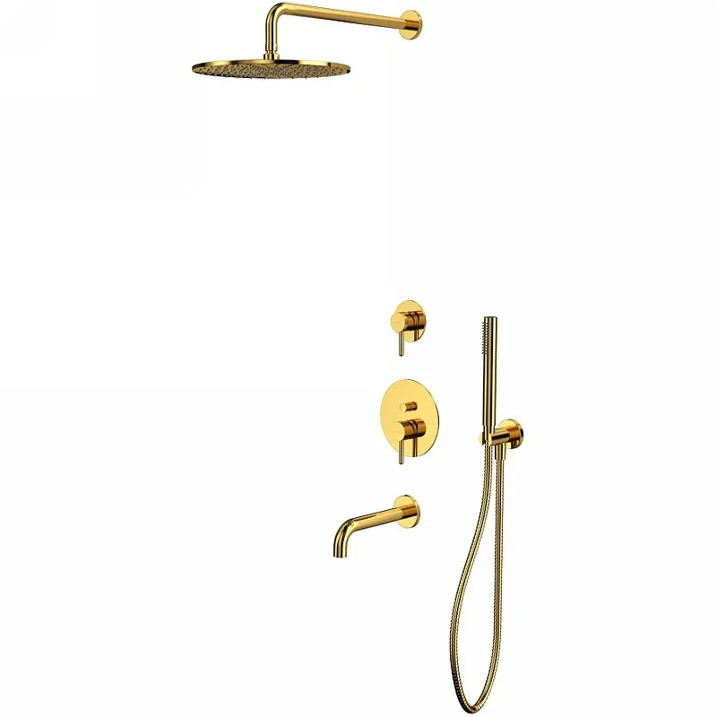 Душевая система Whitecross Y gold YSET07GL.Характеристики: Цвет: золото. Материал: латунь. Управление: однорычажное. Механизм: керамический картридж Kerox. Излив: фиксированный. Аэратор Neoperl. Автоматический переключатель. Количество потребителей: 3. Два входа (для горячей и холодной воды) G 1/2. Два выхода смешанной воды G 1/2. Держатель ручного душа с пластиковой вставкой. Диаметр верхнего душа: 300 мм. Система очистки от известковых отложений. Шаровый шарнир. Размер ручного душа (ШхВхД): 26х225х26. Количество режимов струи ручного душа: 1. Пропускная способность при давлении 3 Бар: верхний душ - 23 л/мин / ручной душ - 13,5 л/мин / излив - 21 л/мин. Длина кронштейна верхнего душа: 405 мм. Душевой шланг в металлической оплетке, длиной 1500 мм. Двусторонняя защита от скручивания. Отверстия для монтажа: 5. Монтаж: встраиваемый. В комплекте поставки: Смеситель (внешняя и внутренняя части) на 2 потребителя - Y1235GL. Смеситель (внешняя и внутренняя части) на 1 потребитель - Y1245GL. Излив Y1200GL. Ручной душ MICRO-GL. Верхний душ Y1300GL. Кронштейн для верхнего душа Y1310GL. Душевой шланг SHS150GL. Шланговое подключение с держателем ручного душа Y1005GL.