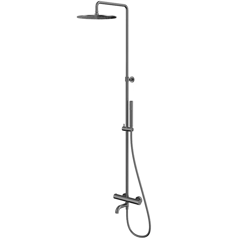 Душевая система Whitecross Y gunmetal Y1234GM с термостатом.Характеристики: Цвет: оружейная сталь. Материал: латунь. Покрытие: PVD. Управление: термостат. Механизм: термостатический картридж с ограничителем на 38 градусов Vernet. Излив: фиксированный. Скрытый аэратор: Neoperl. Запорно-переключающий вентиль. Диаметр верхнего душа: 300 мм. Количество режимов струи ручного душа: 1. Пропускная способность при давлении 3 Бар: верхний душ - 13.6 л/мин, ручной душ - 12.6 л/мин, излив - 18 л/мин. Поворотный кронштейн верхнего душа с регулировкой высоты: 960-1500 мм. Душевой шланг длиной 1500 мм. Стандарт подводки: G1/2. Монтаж: на стену. В комплекте поставки: Смеситель для ванны. Ручной душ. Верхний душ. Душевая штанга. Душевой шланг. Держатель ручного душа.