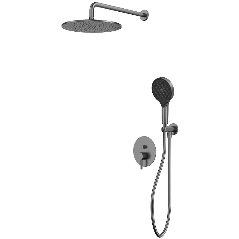 Душевая система Whitecross Y gunmetal YSET04TOPGM.Характеристики: Цвет: оружейная сталь. Материал: латунь. Покрытие: PVD. Управление: однорычажное. Механизм: керамический картридж Kerox. Автоматический переключатель. Количество потребителей: 2. Два входа (для горячей и холодной воды) G 1/2. Два выхода смешанной воды G 1/2. Держатель ручного душа с пластиковой вставкой. Диаметр верхнего душа: 300 мм. Система очистки от известковых отложений. Шаровый шарнир. Размер ручного душа (ШхВ): 132х250 мм. Количество режимов струи ручного душа: 3 (дождь, массаж, туман). Пропускная способность при давлении 3 Бар: верхний душ - 21 л/мин / ручной душ - 13,5 л/мин. Длина кронштейна верхнего душа: 405 мм. Душевой шланг в пластиковой оплетке, длиной 1500 мм. Двусторонняя защита от скручивания. Отверстия для монтажа: 3. Монтаж: встраиваемый. В комплекте поставки: Смеситель (внешняя и внутренняя части) на 2 потребителя - Y1235GM. Ручной душ TOP-GM. Верхний душ Y1300GM. Кронштейн для верхнего душа Y1310GM. Душевой шланг SHP150GM. Шланговое подключение с держателем ручного душа Y1005GM.