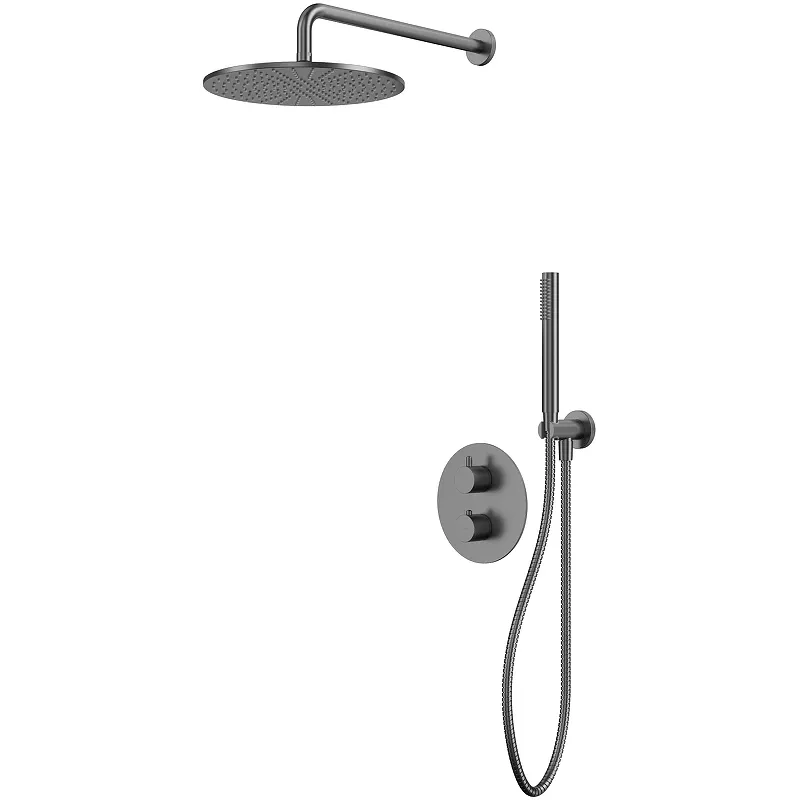 Душевая система Whitecross Y gunmetal YSET08GM с термостатом.Характеристики: Цвет: оружейная сталь. Материал: латунь. Покрытие: PVD. Управление: термостат. Механизм: термостатический картридж с ограничителем на 38 градусов Vernet. Запорно-переключающий вентиль. Количество потребителей: 2. Два входа (для горячей и холодной воды) G 3/4. Два выхода смешанной воды G 1/2. Пропускная способность при давлении 3 Бар: поток 1 - 20.3 л/мин, поток 2 - 20.3 л/мин. Диаметр верхнего душа: 300 мм. Система очистки от известковых отложений. Шаровый шарнир. Размер ручного душа (ШхВ): 26х225 мм. Количество режимов струи ручного душа: 1. Пропускная способность при давлении 3 Бар: верхний душ - 20.3 л/мин, ручной душ - 13.5 л/мин. Длина кронштейна верхнего душа: 405 мм. Душевой шланг в металлической оплетке, длиной 1500 мм. Двусторонняя защита от скручивания. Конические гайки. Шланговое подключение с держателем ручного душа с пластиковой вставкой. Монтаж: встраиваемый. В комплекте поставки: Смеситель для душа (внешняя и внутренняя части) Y1236GM. Ручной душ MICRO-GM Верхний душ Y1300GM. Кронштейн для верхнего душа Y1310GM. Душевой шланг SHS150GM. Шланговое подключение с держателем ручного душа Y1005GM.