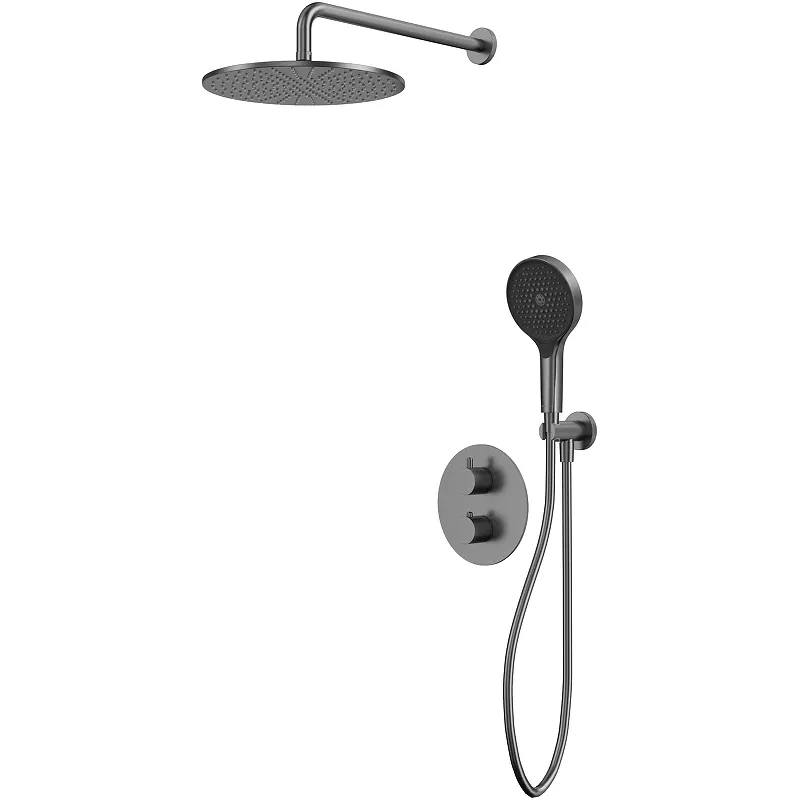 Душевая система Whitecross Y gunmetal YSET08TOPGM с термостатом.Характеристики: Цвет: оружейная сталь. Материал: латунь. Материал ручного душа: пластик. Покрытие: PVD. Управление: термостат. Механизм: термостатический картридж с ограничителем на 38 градусов Vernet. Запорно-переключающий вентиль. Количество потребителей: 2. Два входа (для горячей и холодной воды) G 3/4. Два выхода смешанной воды G 1/2. Пропускная способность при давлении 3 Бар: поток 1 - 20.3 л/мин, поток 2 - 20.3 л/мин. Диаметр верхнего душа: 300 мм. Система очистки от известковых отложений. Шаровый шарнир. Размер ручного душа (ШхВ): 132х250.1 мм. Количество режимов струи ручного душа: 3. Переключение режимов ручного душа: кнопочное. Пропускная способность при давлении 3 Бар: верхний душ - 20.3 л/мин, ручной душ - 13.5 л/мин. Длина кронштейна верхнего душа: 405 мм. Душевой шланг в пластиковой оплетке, длиной 1500 мм. Двусторонняя защита от скручивания. Конические гайки. Шланговое подключение с держателем ручного душа с пластиковой вставкой. Монтаж: встраиваемый. В комплекте поставки: Смеситель для душа (внешняя и внутренняя части) Y1236GM. Ручной душ TOP-GM. Верхний душ Y1300GM. Кронштейн для верхнего душа Y1310GM. Душевой шланг SHP150GM. Шланговое подключение с держателем ручного душа Y1005GM.