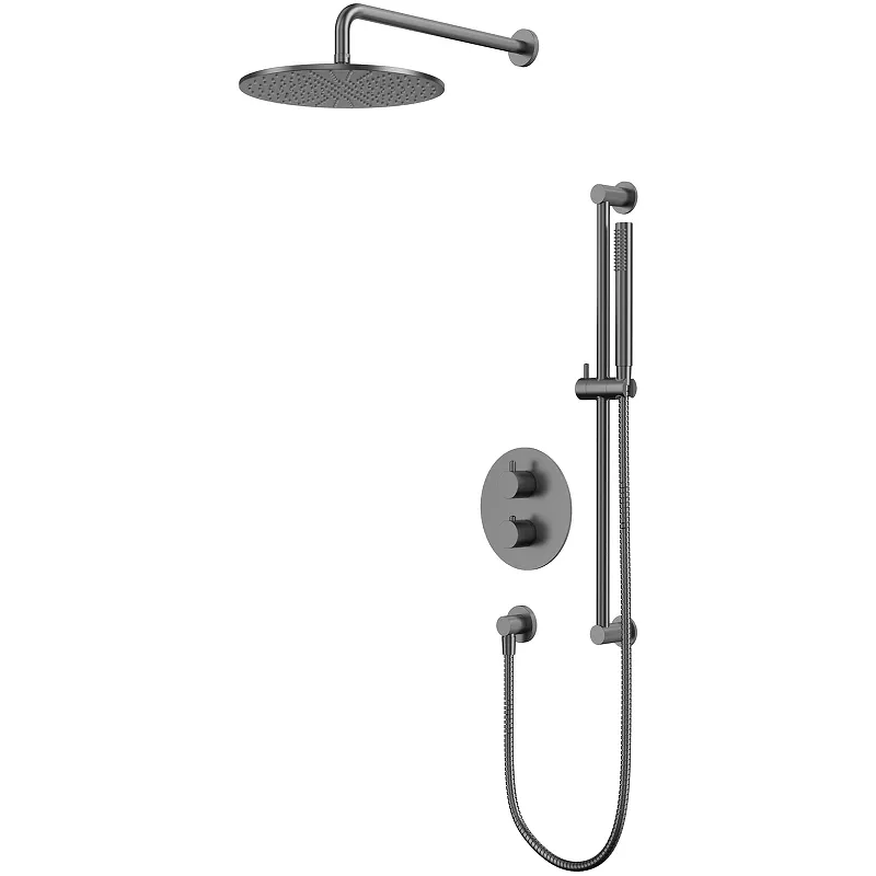 Душевая система Whitecross Y gunmetal YSET09GM с термостатом.Характеристики: Цвет: оружейная сталь. Материал: латунь. Покрытие: PVD. Управление: термостат. Механизм: термостатический картридж с ограничителем на 38 градусов Vernet. Запорно-переключающий вентиль. Количество потребителей: 2. Два входа (для горячей и холодной воды) G 3/4. Два выхода смешанной воды G 1/2. Пропускная способность при давлении 3 Бар: поток 1 - 20.3 л/мин, поток 2 - 20.3 л/мин. Диаметр верхнего душа: 300 мм. Система очистки от известковых отложений. Шаровый шарнир. Размер ручного душа (ШхВ): 26х225 мм. Количество режимов струи ручного душа: 1. Пропускная способность при давлении 3 Бар: верхний душ - 20.3 л/мин, ручной душ - 13.5 л/мин. Длина кронштейна верхнего душа: 405 мм. Душевой шланг в металлической оплетке, длиной 1500 мм. Двусторонняя защита от скручивания. Конические гайки. Высота душевой штанги: 720 мм. Регулируемый по высоте держатель ручного душа. Монтаж: встраиваемый. В комплекте поставки: Смеситель для душа (внешняя и внутренняя части) Y1236GM. Ручной душ MICRO-GM. Верхний душ Y1300GM. Кронштейн для верхнего душа Y1310GM. Душевой шланг SHS150GM. Душевая штанга с держателем для ручного душа Y1010GM. Шланговое подключение Y1008GM.