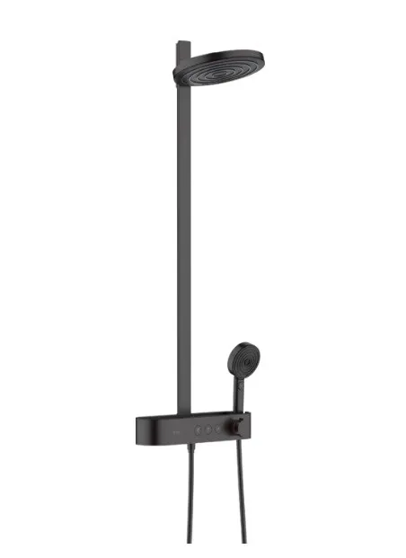 Душевая стойка, Hansgrohe, Pulsify S, смеситель-есть, тип регулирования воды-термостатический картридж, с кнопками "ручной душ", "PowderRain", "Intense PowderRain", верхний душ-есть, форма верхнего душа-круглая, размер верхнего душа,мм-260, держатель верхнего душа-есть, шарнирное соединение: верхний душ с углом наклона 10-30°, вынос, мм-163, поверхность душевого диска-графит, количество режимов верхнего душа-2, тип струи-PowderRain, Intense PowderRain, ручной душ-есть, количество режимов ручного душа-3, тип струи-PowderRain, IntenseRain, массажная, полка из пластика, цвет-матовый черный арт-24240670