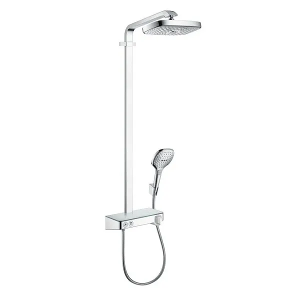 Душевая стойка, Hansgrohe, Raindance Select E, тип регулирования воды-термостатический картридж, верхний душ-есть, форма верхнего душа-квадратная, размер верхнего душа-300*160, держатель верхнего душа-есть, вынос, мм-380, количество режимов верхнего душа-2, тип струи верхнего душа-RainAir, Rain, ручной душ-есть, размер ручного душа-122, шланг-есть, размер шланга, мм-1600, цвет-хром арт-27283000