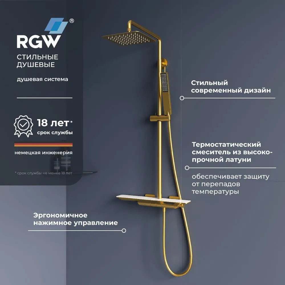 Душевая стойка RGW SP-34-Gb Золото браш Головной душ/Термостат (Ручной душ. Шланг 1,5 м.)