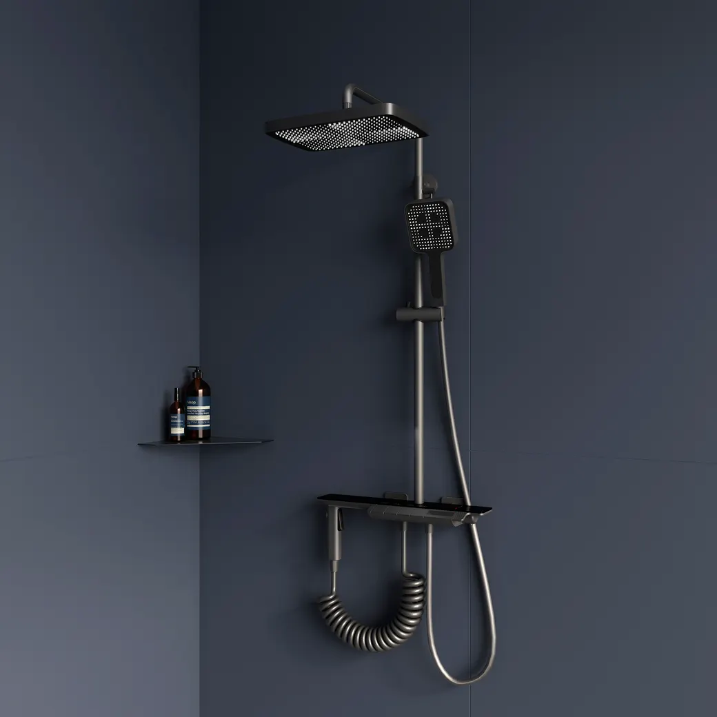 Комплектация и материал исполнения: Головной душ из высокопрочного ABS-пластика оснащён со шарнирным креплением, что позволяет выбрать необходимый угол направления воды;, Шланг ручного душа из ПВХ, длина 1.5 м;, Ручной душ - 2 режима работы, выполнен из высокопрочного ABS-пластика;, Держатель ручного душа с регулировкой высоты;, Стальная штанга с регулировкой высоты головного;, Встроенный излив-водопад;, Вместительная стеклянная полка для душевых принадлежностей;, Прохладная поверхность панели управления в процессе использования;, Термостатический смеситель выполнен из высококачественной латуни, обеспечивает защиту от перепадов температуры., Дополнительный мини душ - 2 режима: душ для поддержания гигиены душевого пространства и для ухода за животными.
