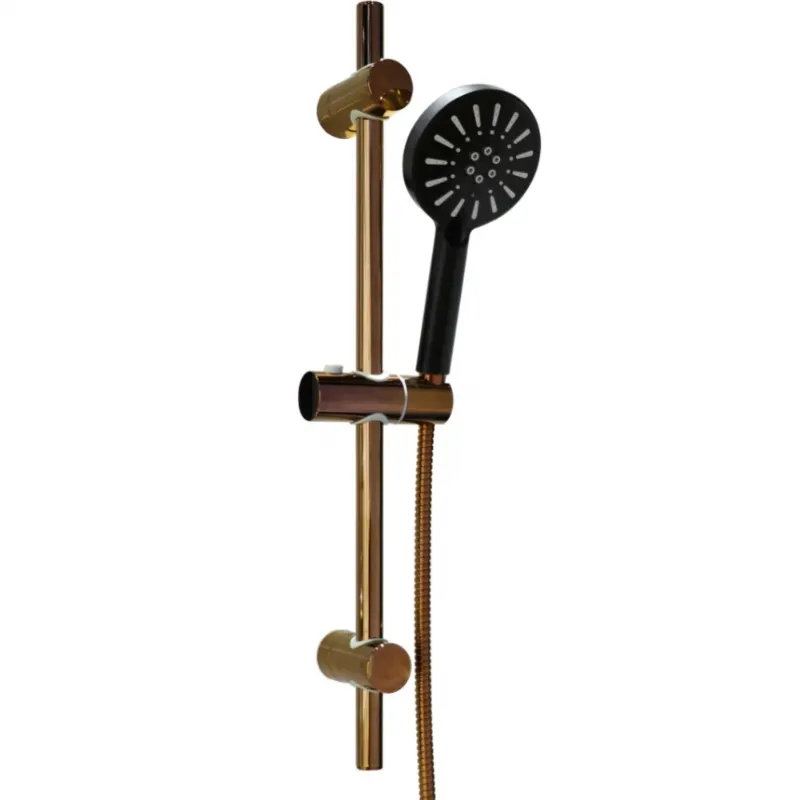 Душевой гарнитур Bien Hermes BD24031513.Превосходно дополнит интерьер любой ванной комнаты в современном стиле. Цвет: розовое золото, лейка черная. Материал: пластик. Ручной душ с 3 режимами струи и форсунками с защитой от известковых отложений. Душевая штанга высотой 60 см с регулируемым держателем для лейки. Металлический душевой шланг длиной 1,5 м. Стандарт подключения: G 1/2. В комплекте поставки: штанга, лейка, шланг, крепления.