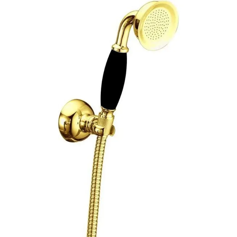 Душевой гарнитур Boheme Imperiale 408-B.Характеристики: Цвет: золото. Материал: латунь. Ручка керамическая черного цвета. Размер ручного душа (ШхВ): 77х243 мм. Количество режимов струи: 1. Душевой шланг длиной 1500 мм. Стандарт подводки: G1/2. Отверстия для монтажа: 1. Монтаж: на стену. В комплекте поставки: Ручной душ. Душевой шланг. Настенный держатель для ручного душа.