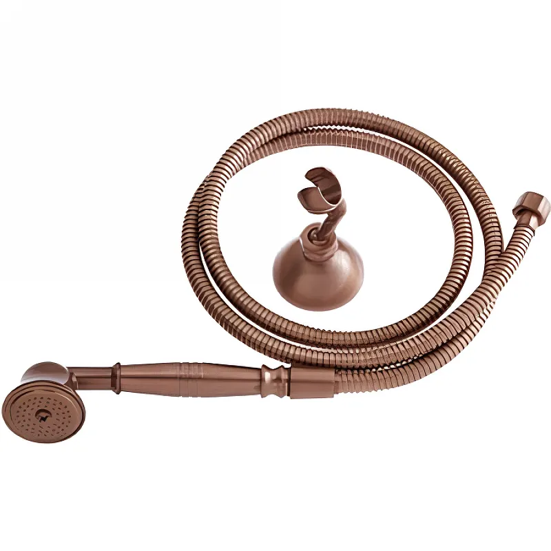 Душевой гарнитур GPD Nino SPS05-B.Характеристики: Цвет: медь. Материал: латунь. Количество режимов струи ручного душа: 1. Длина душевого шланга 1500 мм. Шарнирный регулируемый кронштейн для ручного душа. Монтаж: на стену. В комплекте поставки: Ручной душ. Держатель ручного душа. Душевой шланг.