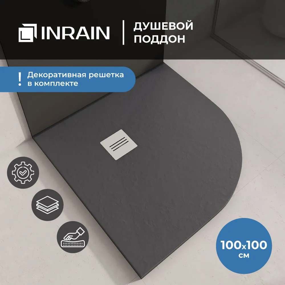 Душевой поддон INRAIN R-100100, выполненный в графитовом цвете, идеально подходит для создания стильной и функциональной душевой зоны. Полукруглая форма и размеры 100x100 см позволяют эффективно использовать пространство, делая его более просторным и современным.