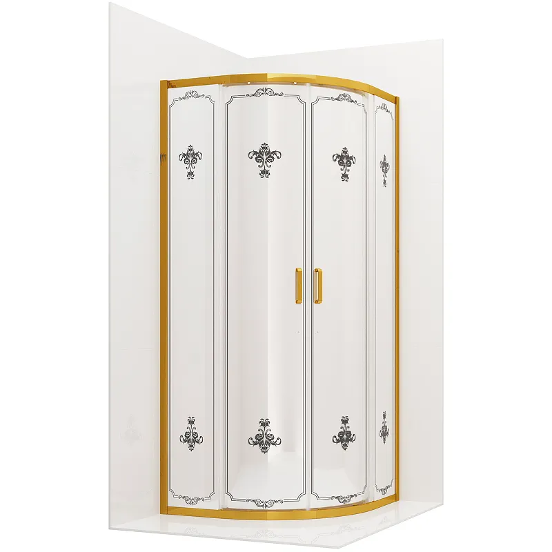 - Элегантный дизайн: Золотой профиль и белое стекло с рисунком создают стильный акцент в вашей ванной комнате.