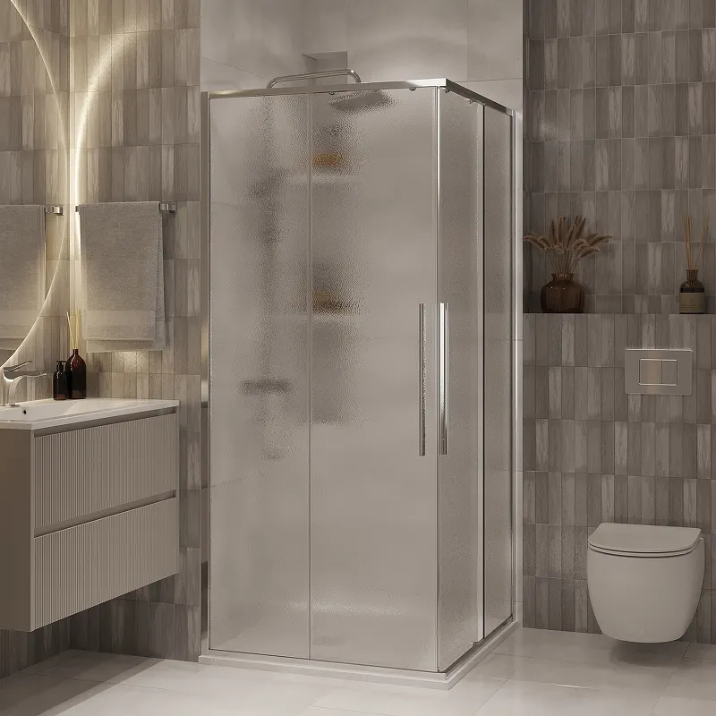 Поддон в комплект не входит. Этот душевой уголок с раздвижными дверями и стеклом "шиншилла" станет функциональным дополнением вашей ванной комнаты.