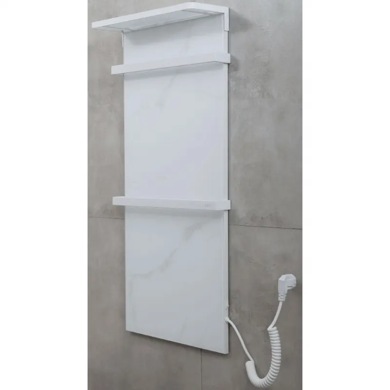 Электрический полотенцесушитель Black&White Universe 388WM с полкой - идеально выполнит свои функции и сэкономит пространство в Вашей ванной комнате. Добавьте в свою ванную комнату элемент роскоши, установив электрический полотенцесушитель, основой которого станет современный материал с имитацией натурального гранита.Благодаря нагревательному элементу нового поколения из карбона Вы можете быть абсолютно уверены в безопасности изделия.Технические характеристики: Цвет: белый мрамор. Габариты: 400 x 899 x 139 мм. Количество перекладин: 2, расположение - лесенка. Материал: алюминиевая панель, закаленное стекло. Материал нагрева: углеродное волокно. Переключатель включения / выключения. Температура нагрева: 55-65 градусов по Цельсию. Мощность: 120 Вт. Напряжение: 220 - 240 V. Частота переменного тока: 50 Гц. Протокол IP: IPX4. Подключение: с помощью кабель-вилки. Длина шнура питания: 10/25/10 см (шнур/пружина/шнур). Монтаж: на стену. В комплекте поставки: электрический полотенцесушитель.
