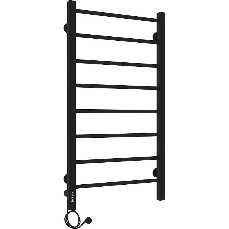 Электрический полотенцесушитель Laris Феличия ЧКЧ8 400х800 L 73207612.Характеристики: Цвет: черный муар. Материал: сталь. Покрытие: краска порошковая черная RAL 9005 (черный матовый муар). Форма: лесенка. Количество перекладин: 8. Форма профиля: квадратная, круглая. Мощность: 155 Вт. Напряжение: 220 В. Частота тока: 50Гц. Температура поверхности изделия: 50 C. С терморегулятором. С таймером. С возможностью скрытого монтажа. Регулятор: на стойке. Размещение шнура: слева. Диаметры и толщина: стойка 30х30, толщина 1,5 мм; перемычка d=20, толщина 1,5 мм. В комплекте поставки: Полотенцесушитель. Модуль скрытого монтажа. Крепление (шуруп оцинкованный с дюбелем, пластиковое крепление, резьбовая втулка, штифт) - 4 шт. Ключ шестигранный. Паспорт. Упаковка (короб картонный, чехол полиэтиленовый, чехол полиэтиленовый для крепления, коробочка для креплений).