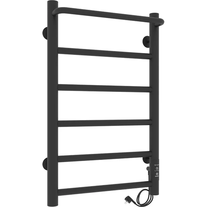 Электрический полотенцесушитель Laris Прайм ЧКЧ П6 400x600 R 73207593.Характеристики: Цвет: черный муар. Материал: конструкционная сталь. Покрытие: краска порошковая черная RAL 9005 (черный матовый муар). Форма: лесенка. Количество перекладин: 6. Форма профиля: круглая. Мощность: 80 Вт. Напряжение: 220 В. Частота тока: 50Гц. Температура поверхности изделия: 50 C. С терморегулятором. С таймером. С возможностью скрытого монтажа. Регулятор: на стойке. Размещение шнура: справа. Диаметры и толщина: стойка d=32, толщина 1,5мм; перемычка d=20, толщина 1,5 мм. В комплекте поставки: Полотенцесушитель. Модуль скрытого монтажа. Крепление (шуруп оцинкованный с дюбелем, пластиковое крепление, резьбовая втулка, штифт) - 4 шт. Ключ шестигранный. Паспорт. Упаковка (короб картонный, чехол полиэтиленовый, чехол полиэтиленовый для крепления, коробочка для креплений).