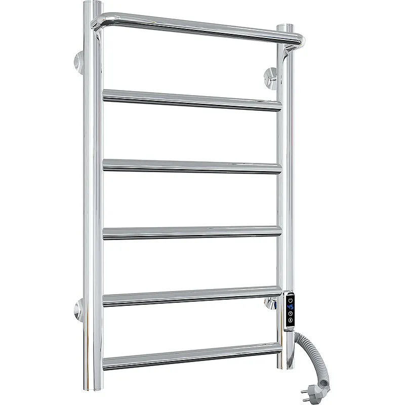 Электрический полотенцесушитель Laris Прайм П6 400х600 R 73207648.Характеристики: Цвет: хром. Материал: нержавеющая сталь AISI 304. Покрытие: хром отполированный до зеркального блеска. Форма: лесенка. Количество перекладин: 6. Форма профиля: круглая. Мощность: 80 Вт. Напряжение: 220 В. Температура поверхности изделия: 50 C. С терморегулятором. С таймером. Регулятор: на стойке. Размещение шнура: слева. Диаметры и толщина: стойка d=32, толщина 1,5 мм, ребра d=20, толщина 1,5 мм. В комплекте поставки: Полотенцесушитель. Крепление (шуруп оцинкованный с дюбелем, пластиковое крепление, резьбовая втулка, штифт) - 4 шт. Ключ шестигранный. Паспорт. Упаковка (короб картонный, чехол полиэтиленовый, чехол полиэтиленовый для крепления, коробочка для креплений).
