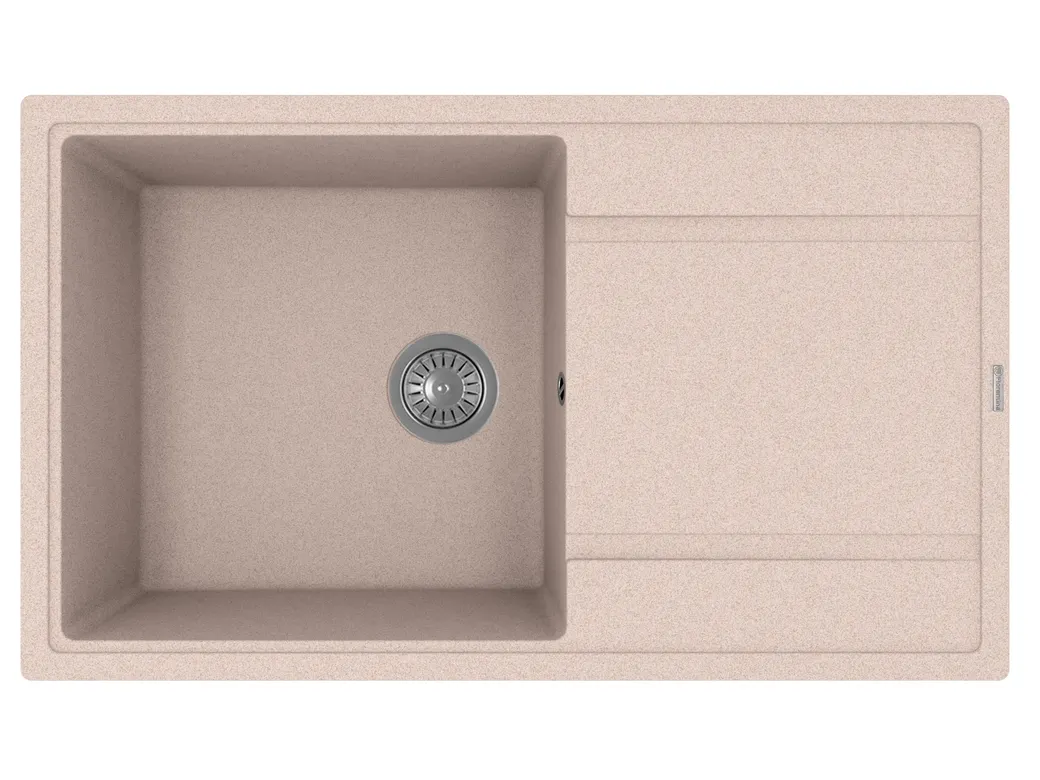 - Кухонная мойка из кварца: высококачественный материал обеспечивает стойкость к повреждениям и долговечность.