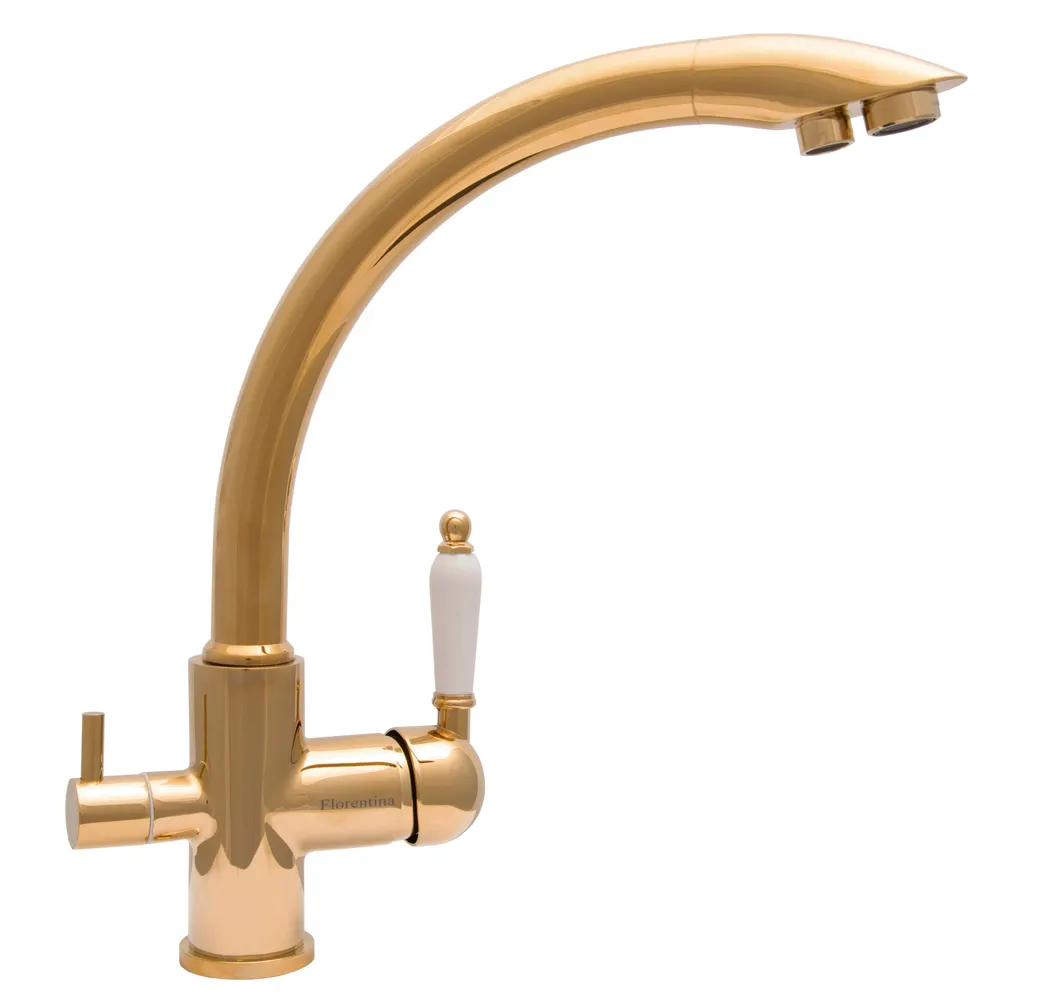 Кухонный смеситель Florentina Смеситель ШАЛЕ в изысканном золотом исполнении станет стильным акцентом в интерьере вашей кухни. Этот смеситель для кухни из нержавеющей стали не только привлекает внимание своим внешним видом, но и обеспечивает удобство и функциональность.