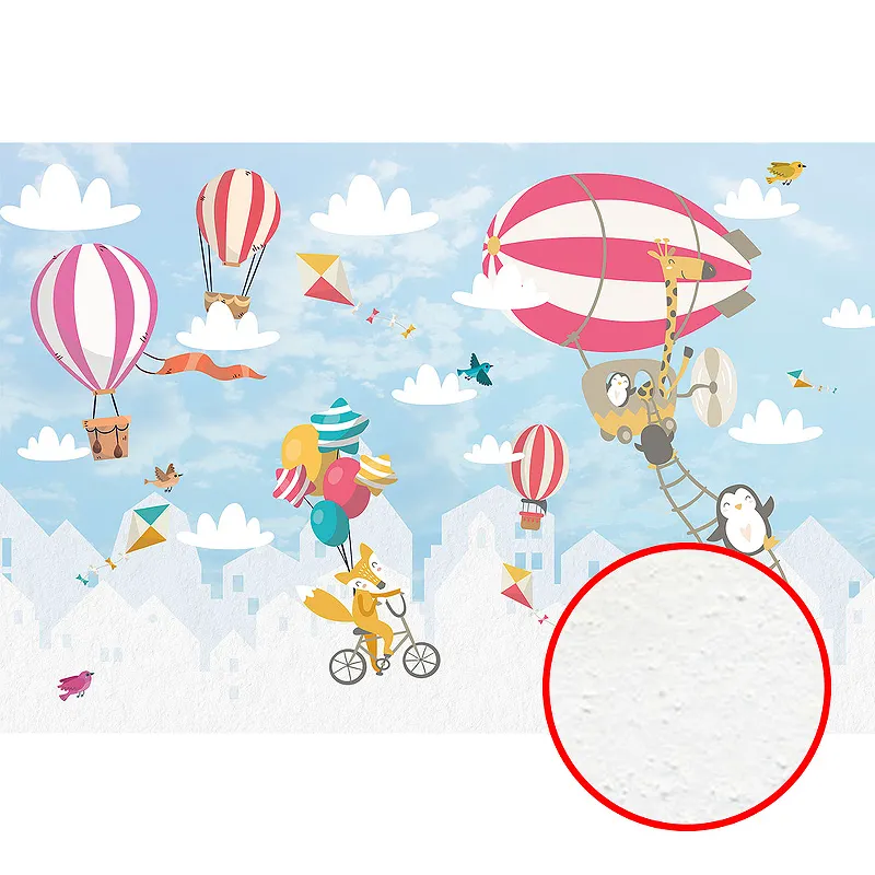 Флизелиновая основа с текстурированным напылением, имитирующим декоративную штукатурку, доступная в размерах 4 м на 2,7 м, с изображениями животных и воздушных шаров.
