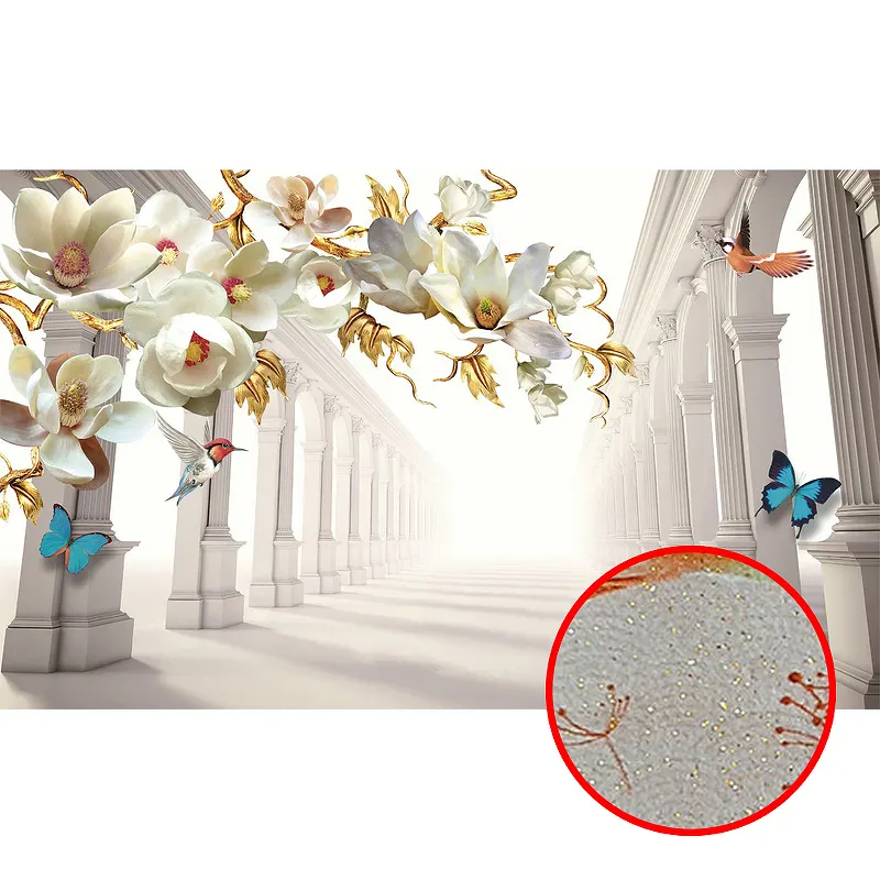 - Универсальный дизайн: Сочетание архитектуры, цветов и бабочек позволяет фреске вписаться в любой интерьер, делая его стильным.