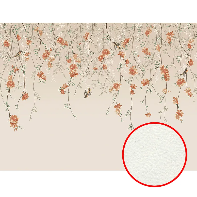 Фреска Ortograf Chinoiserie 33932 Фактура флок FLK Флизелин (4*3) Бежевый/Оранжевый, Цветы/Птицы