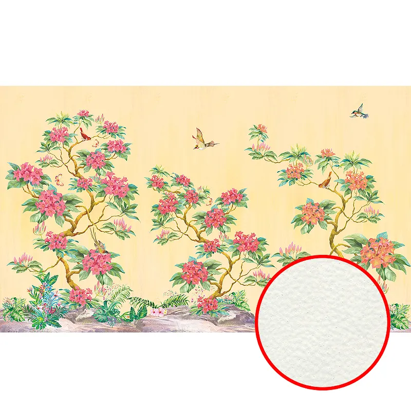 Фреска Ortograf Flora 31111 Фактура флок FLK Флизелин (4,5*2,7) Желтый/Розовый/Зеленый, Деревья/Цветы/Птицы