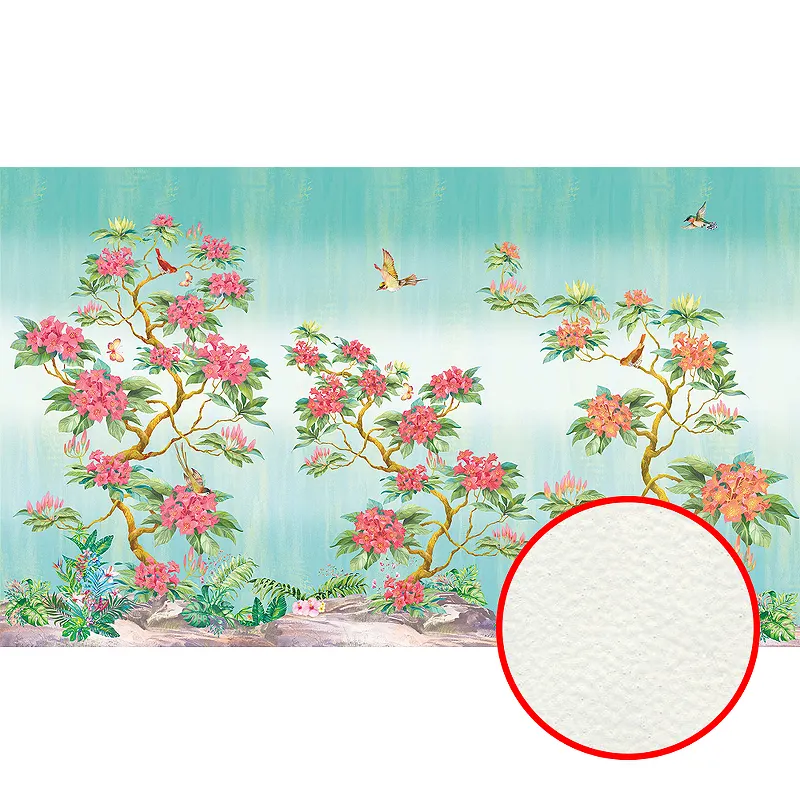 Фреска Ortograf Flora 31116 Фактура флок FLK Флизелин (4,5*2,7) Бирюзовый/Зеленый/Розовый, Деревья/Цветы/Птицы