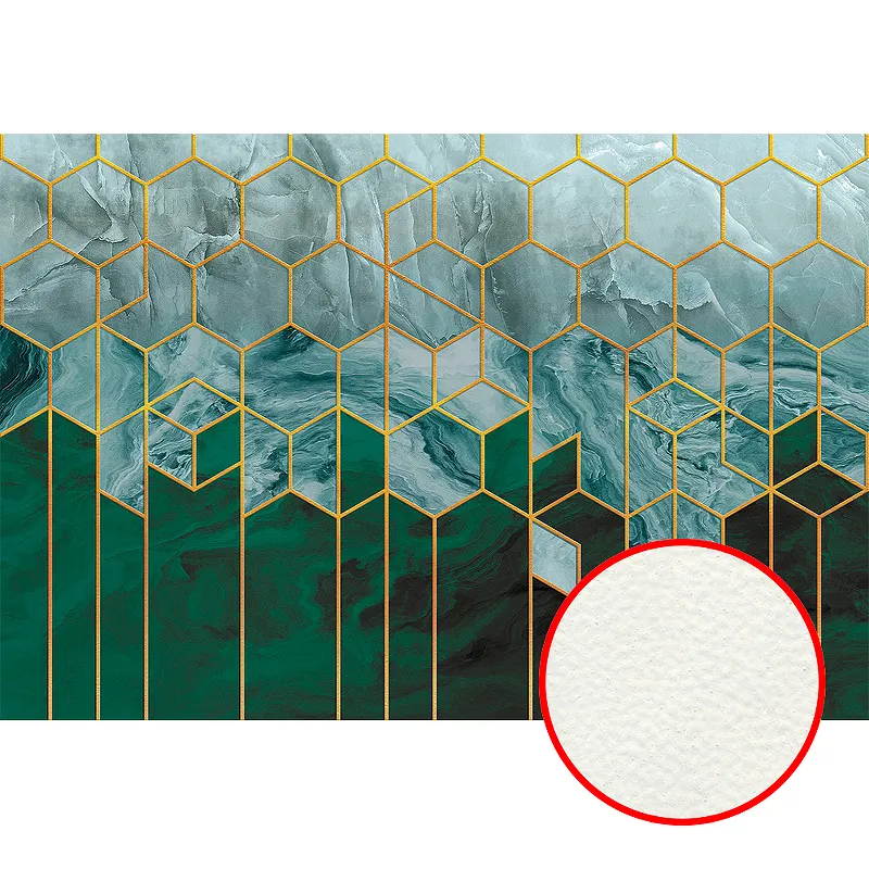 - Фреска флизелиновая (4*2,7 м) с текстурированным напылением, в цветах зелёный, синий, золото, с рисунком геометрия и абстракция.